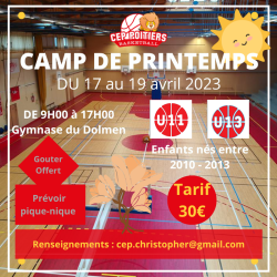 Du lundi 17 au mercredi 19 avril aura lieu le camp de Printemps du CEP. Venez participer à notre camp de février au dolmen, pour les catégories U11(2012-2013) et U13(2010-2011).